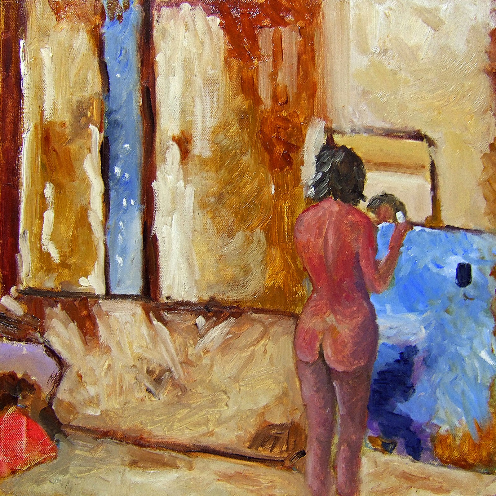 The above is the finished image for now I feel I've done too much on the figure and need to undo a few things maybe the bed was better just with the under sheet. I'll have to look into these but overall I feel I have done what I set out too do which was to look at a different style and try and loosen up in my painting strokes.